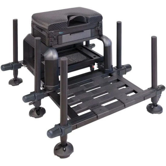 Echipat cu o tava din aluminiu tip "tray", acest scaun modular este proiectat pentru a va ajuta sa va organizati echipamentul intr-un mod eficient si accesibil. Sertarele laterale, compartimentele si alte elemente de depozitare permit organizarea eficienta a echipamentului de pescuit si accesul rapid la diverse accesorii, momeli sau instrumente esentiale. Se pot adauga sertare suplimentare pentru a ajunge la inaltimea dorita (daca este cazul) si putea beneficia de un pescuit cat mai confortabil, este valabil si in cazul tavilor de tip “Tray” acestea pot fi achizitionate separat pentru a suplimenta spatiul de depozitare. Se poate renunta complet compartimentul tavilor “Tray” pentru a reduce greutatea scaunului sau pentru a adaposti bacuri de nada in timpul ploii daca tava laterala nu dispune de paravan cu protectie. De asemenea, poate fi usor transportat datorita designului sau compact si a unor accesorii cum ar fi cureaua pentru umar captusita. Picioarele robuste cu diametrul de 36mm, inclusiv 4 picioare telescopice reglabile si 2 picioare fixe, asigura o stabilitate excelenta si permit scaunului sa poata fi adaptat la diferite inaltimi, asigurand o pozitie confortabila si stabila chiar si pe terenuri neuniforme. Picioarele permit atasarea unui numar variat de accesorii precum brate feeder, adaptori pentru juvelnic, tavi laterale sau suporturi pentru umbrele. Sistemul de fixare al picioarelor cu care este dotat scaunul este unul clasic, ce asigura o fixare ferma a acestora, unul ce v-a elimina aparitia oricarui “joc” nedorit.